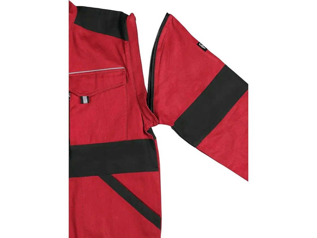 Bluza robocza CXS Luxy Eda czerwono-czarna – męska bluza, odpinane rękawy z elastycznym mankietem, kryte zapięcie na zamek i rzepy, kieszenie na piersi z patkami, ukryta kieszeń na piersi na zamek, zwykłe kieszenie boczne, dolna część na bokach z wszytą gumą, elementy odblaskowe.