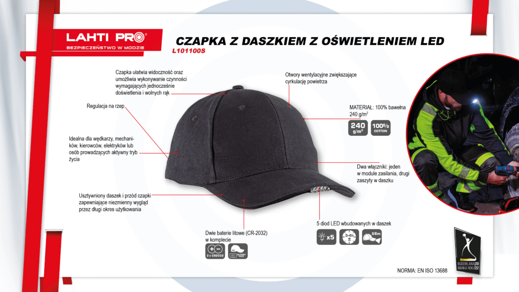 - Czapka ułatwia widoczność oraz umożliwia wykonywanie czynności wymagających jednocześnie doświetlenia i wolnych rąk.