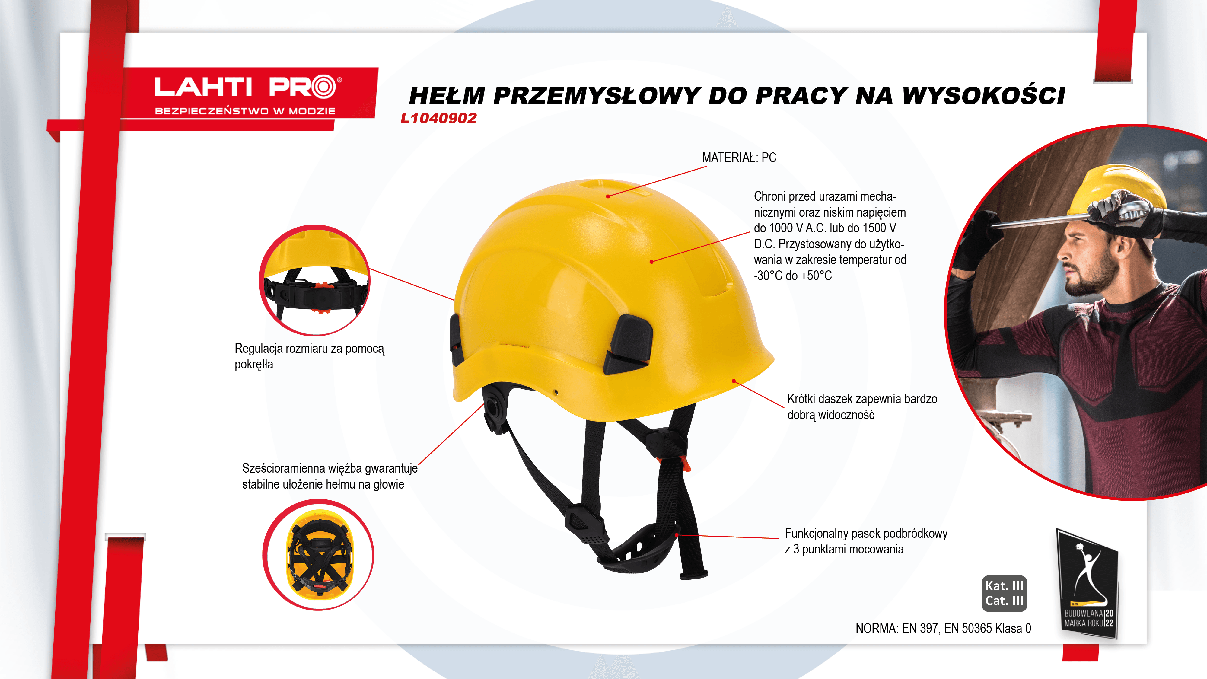 Model L1040902 posiada regulację obwodu, co umożliwia idealne dopasowanie do głowy. Wewnętrzna opaska tekstylna zapewnia komfort noszenia i stabilność, nawet przy długotrwałej pracy. Kask wyposażony jest również w otwory montażowe, które pozwalają na przymocowanie dodatkowych akcesoriów, takich jak osłony twarzy, nauszniki ochronne czy latarki.