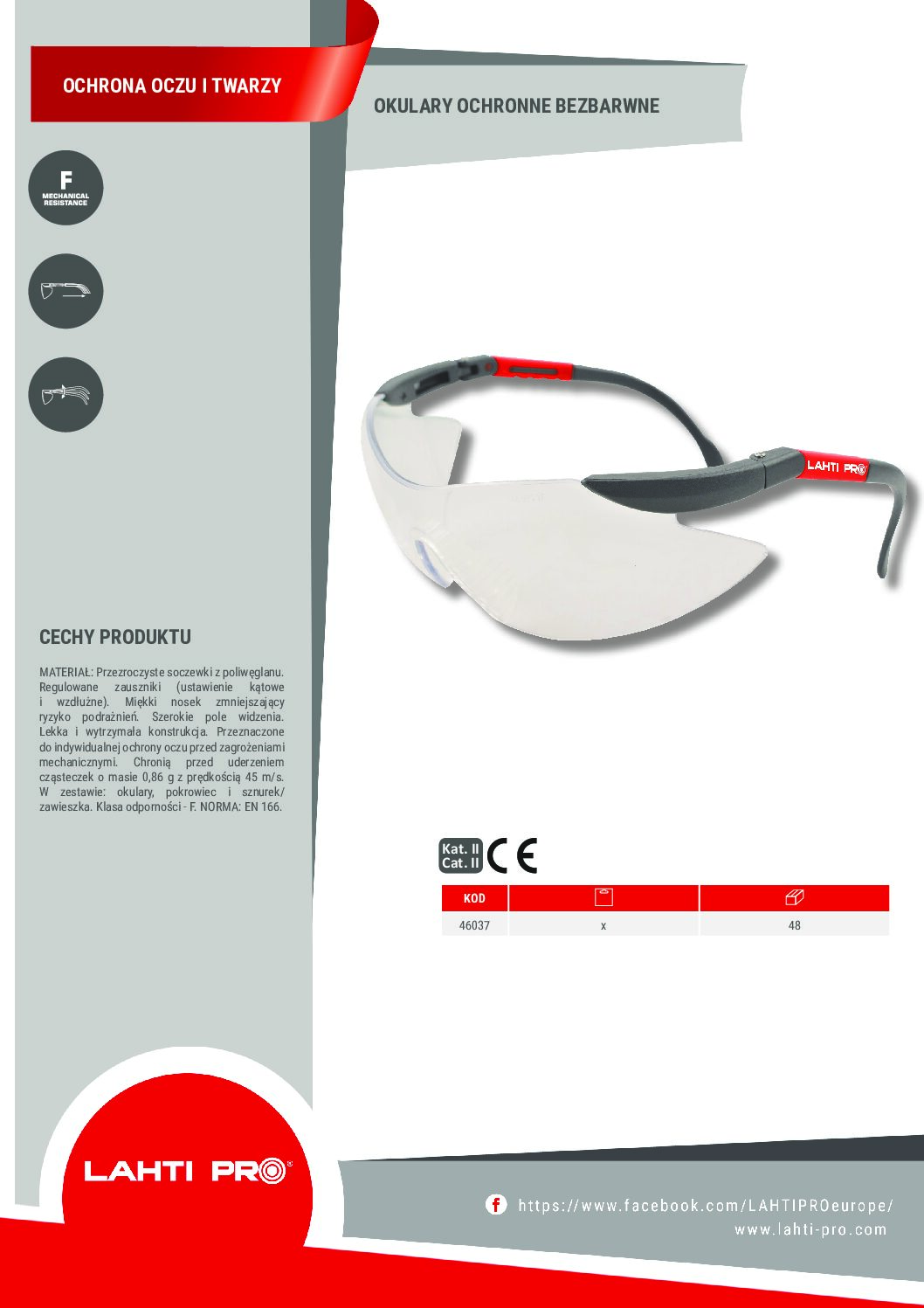Okulary ochronne 46037 LAHTI PRO- zostały zaprojektowane w celu zapewnienie ochrony oczu i wzroku przed cząsteczkami poruszającymi się z dużą prędkością. Okulary ochronne spełniają wymagania dyrektywy PPE 89/686/EWG oraz są zgodne z normą EN 166 jako środki ochrony osobistej.Okulary ochronne są przeznaczone do ochrony oczu przed mechanicznymi uderzeniami różnymi elementami, jak: opiłki metali, odpryski drewna, muru, różnego rodzaju cieczy, itp.