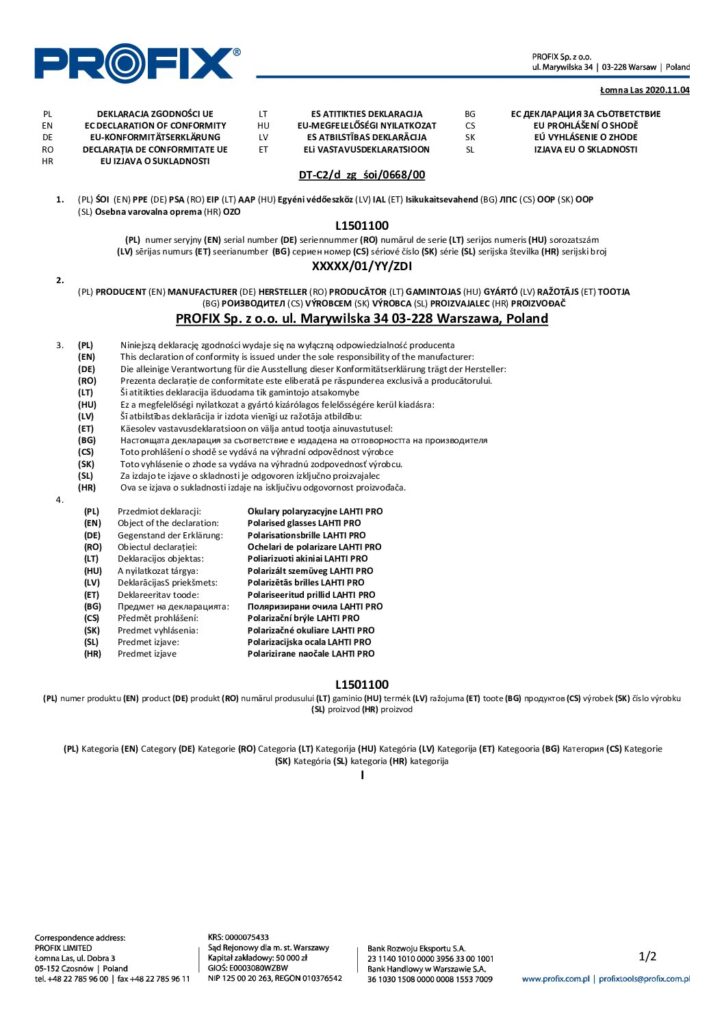 - Okulary Lahti Pro L1501100 posiadają deklarację CE.