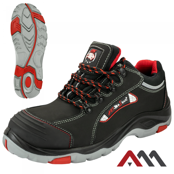 - Podeszwa: urzeźbiona z czerwonymi wstawkami: GUMA / PU, montaż metodą wtrysku, odporna na olej, benzynę, smary i inne rozpuszczalniki organiczne (FO).