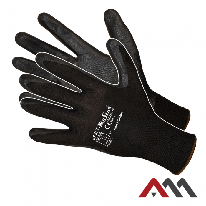 Rękawice ochronne wykonane z dzianiny nylonowej w kolorze czarnym, powlekane spienionym nitrylem w kolorze czarnym, bezszwowe, zakończone ściągaczem. Struktura ryflowana – poprawiająca chwytność.