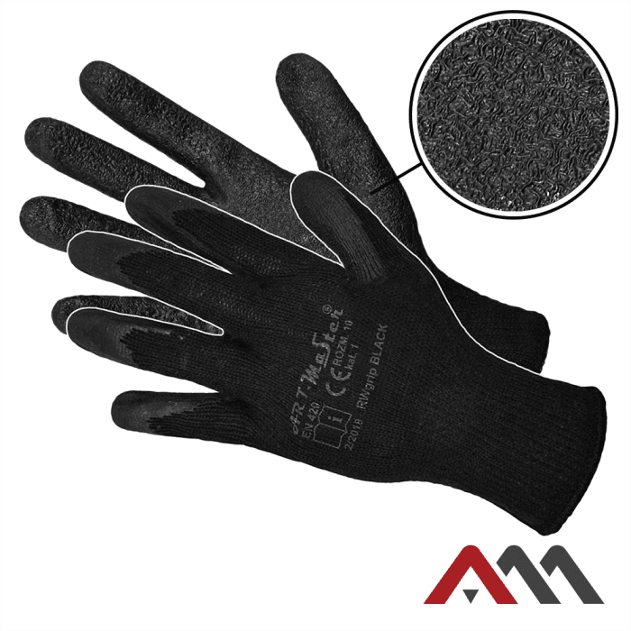 Rękawice ochronne wykonane z dzianiny bawełniano – poliestrowej w kolorze czarnym, w części chwytnej powlekane lateksem w kolorze czarnym.Wytrzymałe, elastyczne, odporne na ścieranie i rozerwanie. Dobrze dopasowują się do dłoni. Szorstkowana powłoka lateksowa zapewnia zręczność i pewny chwyt trzymanych narzędzi, zmniejsza wnikanie brudu.