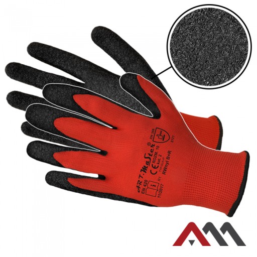 Rękawice ochronne, wykonane z dzianiny poliestrowej w kolorze czerwonym, powlekane lateksem w kolorze czarnym. Wytrzymałe, elastyczne, dobrze dopasowują się do dłoni. Szorstkowana powłoka lateksowa zapewnia zręczność i pewny chwyt trzymanych narzędzi, zmniejsza wnikanie brudu.