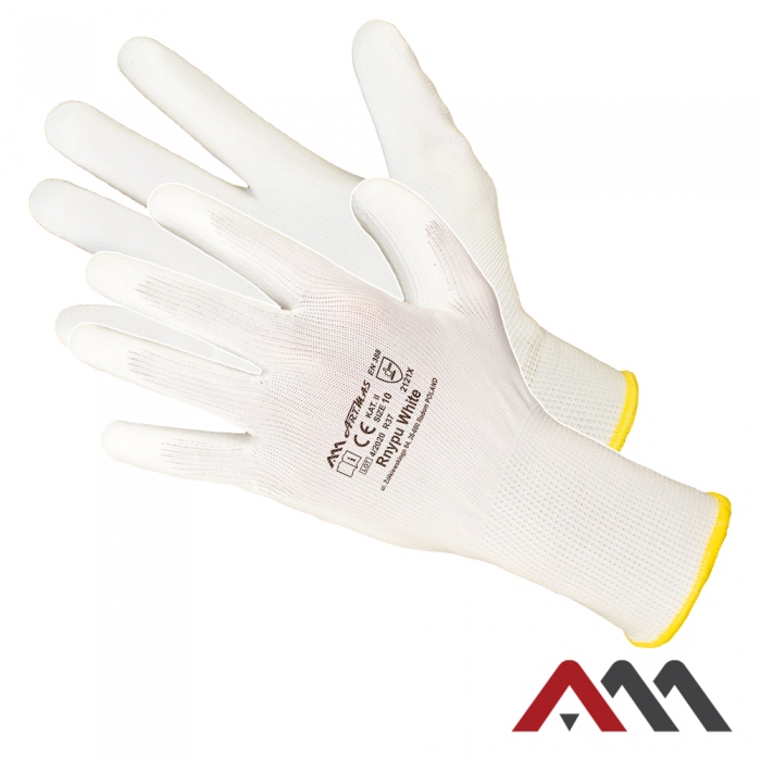 Rękawice ochronne dziane bezszwowe w kolorze białym, wykonane z dzianiny poliestrowej, powlekane poliuretanem (PU) w kolorze białym, zakończone elastycznym ściągaczem. Wytrzymałe, elastyczne, odporne na ścieranie i rozerwanie. Dobrze dopasowują się do dłoni. Zapewniają zręczność i pewny chwyt trzymanych narzędzi, powłoka PU zmniejsza wnikanie brudu.